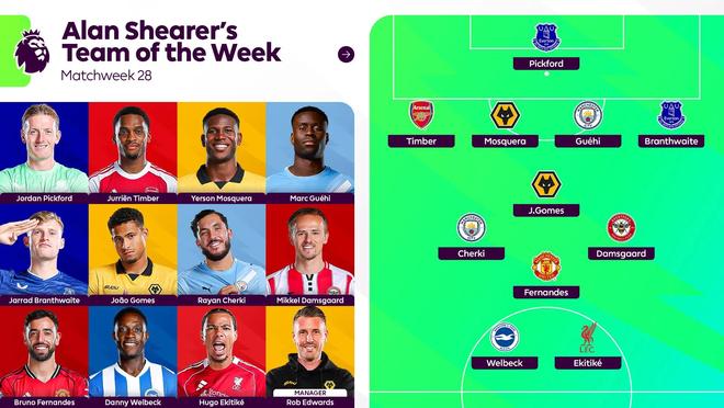 英超聯(lián)賽官方公布了阿蘭-希勒評(píng)選的第28輪最佳陣容,埃基蒂克、布魯諾-費(fèi)爾南德斯、謝爾基、廷貝爾等人在列。